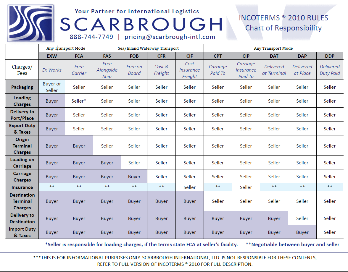- A list of INCOTERMS and their definitions can be found on our website at http://www.scarbrough-intl.com/incoterms/.